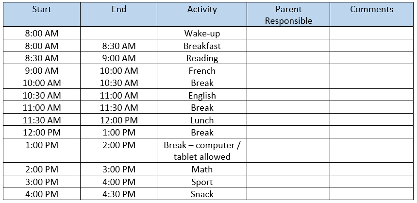 I built a weekly schedule for the whole family, with hours dedicated to French, English, Mathematics, Sciences, and Sports. I printed it out and put it on the fridge. In the beginning, I or my husband were initiating the routine. After a couple of weeks, my son started to remember the timetable hours, mainly the break times😊. We had to check what he was doing about every hour, except, of course, for the break times. Little questions like: